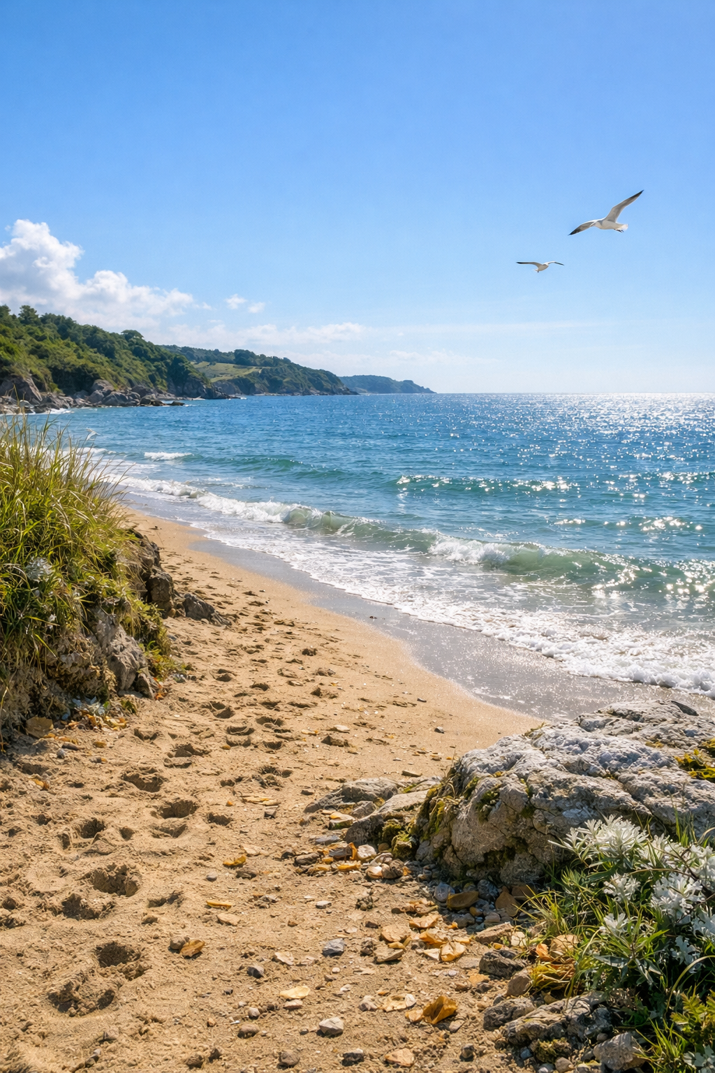 Autour de toi, les sons se mêlent sans jamais s’imposer. Le ressac, régulier, profond, vient et repart, comme une respiration lente. Par moments, une vague se brise un peu plus fort, éclaboussant l’air d’un souffle humide. Plus loin, des mouettes appellent, leurs cris étirés se fondant dans le vent. Et sous tes pas, le sable crisse doucement, un murmure discret qui accompagne ta marche.