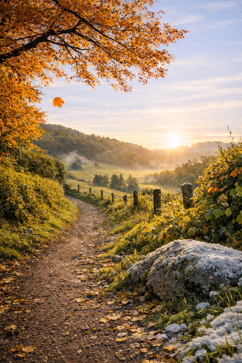 Tu avances dans un chemin creux du bocage, en pleine campagne, un après‑midi d’automne qui s’étire vers la fin du jour. La lumière est basse, dorée, presque cuivrée, et elle glisse entre les branches des chênes et des châtaigniers comme une dernière caresse avant la nuit. Elle touche ta peau, chaude encore, mais déjà traversée d’une pointe de fraîcheur.