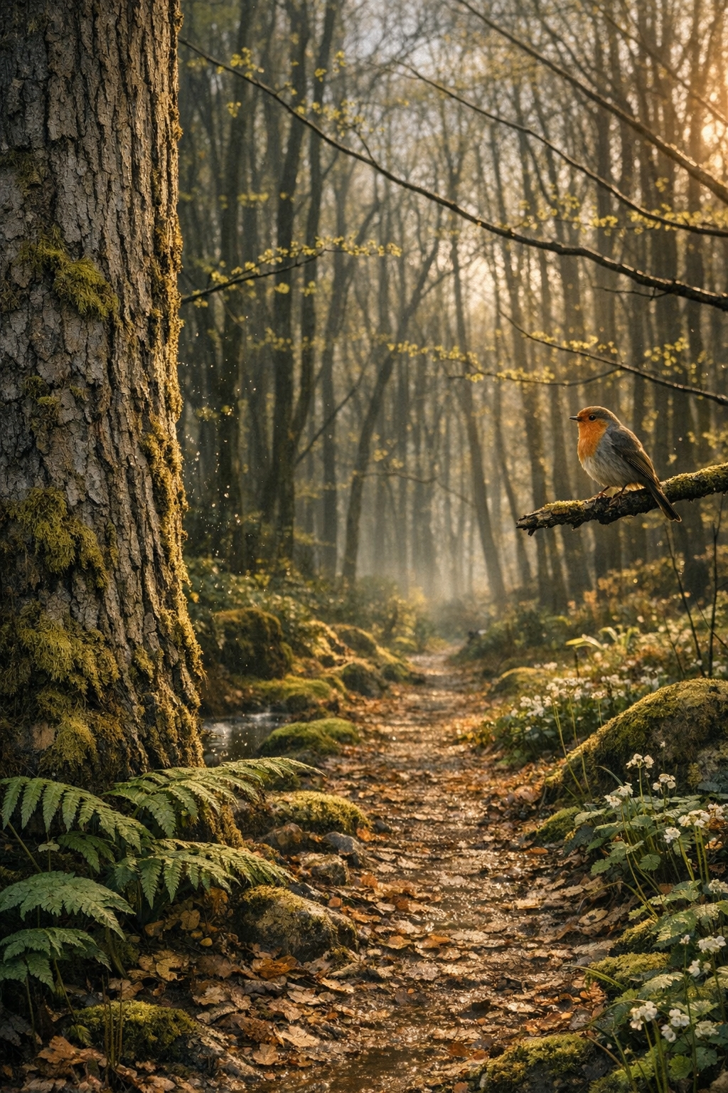 Autour de toi, les sons se multiplient, comme si la forêt ouvrait les yeux en même temps que toi. Sous tes pas, les feuilles mortes murmurent, un craquement léger qui se mêle au chant clair d’un merle perché quelque part au-dessus de toi. Plus loin, un rouge-gorge lance une série de notes rapides, presque impatientes, comme s’il annonçait quelque chose. Le vent, lui, passe entre les arbres comme une respiration profonde, et tu as l’impression de marcher au rythme de cette forêt qui s’éveille.